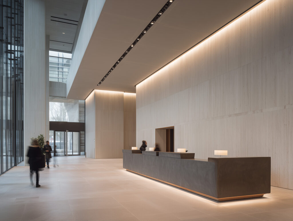 The lobby at One Embankment Place is conceived as a civic threshold — a space whose scale and material resolution signal, before a word is spoken, the calibre of the organisation it serves. Stone-clad walls of exceptional grain, a monolithic reception desk, and a continuous cove of warm light combine to create an arrival sequence that belongs in a different category to conventional corporate reception design.