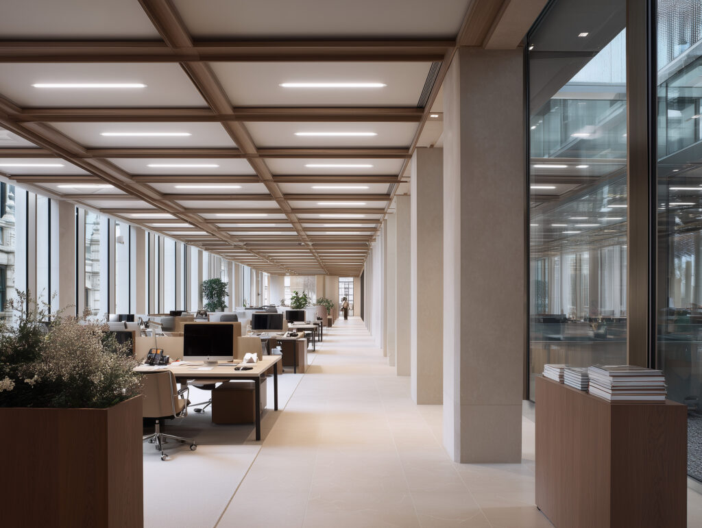 The open-plan floors were designed around a coffered timber ceiling system that brings warmth, acoustic intelligence, and a sense of human scale to the largest working floor plates. Floor-to-ceiling glazing on all primary elevations ensures that daylight penetrates the full depth of each plate.