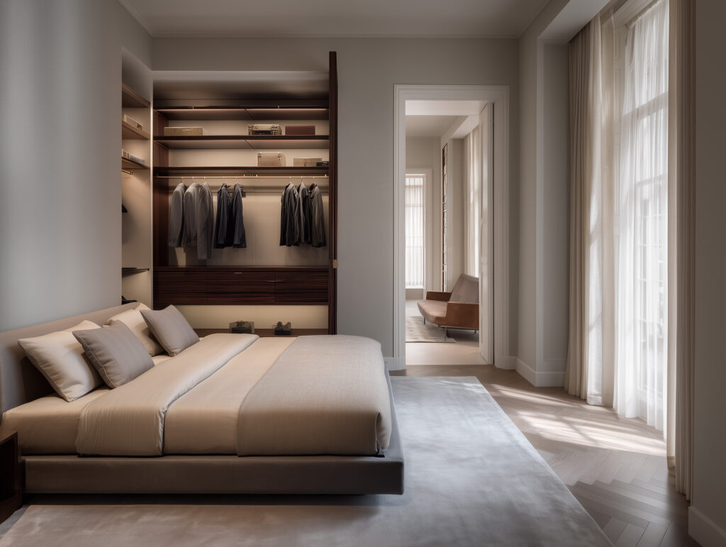 In the principal bedroom suite, the architecture recedes so that calm can fill the space entirely. A low-profile bed in warm linen sits against an open wardrobe of dark figured walnut, its interior glowing with concealed LED lighting that turns storage into a display of quiet craftsmanship.