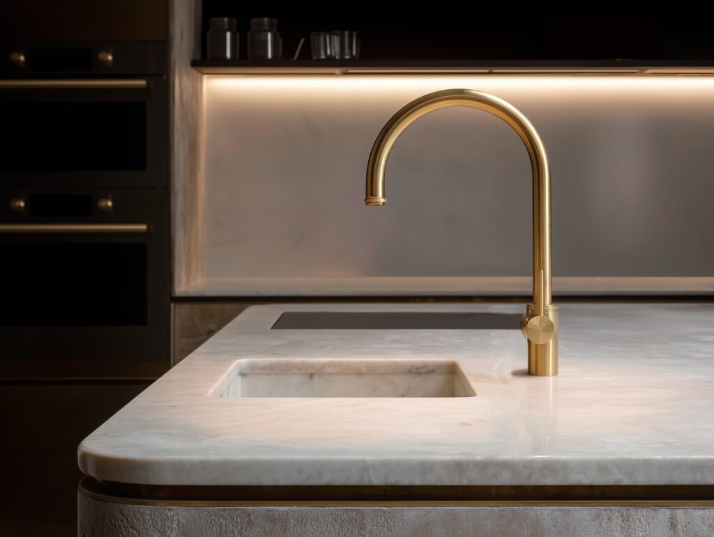 At T&V Architects, the kitchen is never merely functional — it is an exercise in material intelligence. A thick slab of white quartzite forms the island worktop, its veining chosen for its particular quality in morning light. Set into the stone, a brushed brass tap of sculptural simplicity rises above an undermount sink with an elegance that makes the everyday feel considered.