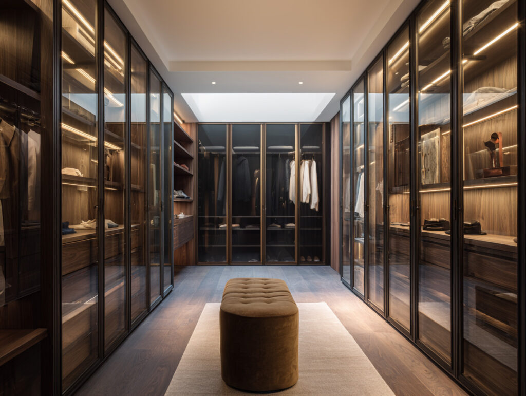 The dressing rooms designed by T&V Architects are conceived as private sanctuaries in their own right. Full-height cabinetry in smoked walnut with bronze-framed glass doors lines both walls of a generous corridor, each unit internally lit to display its contents with the precision of a luxury boutique.