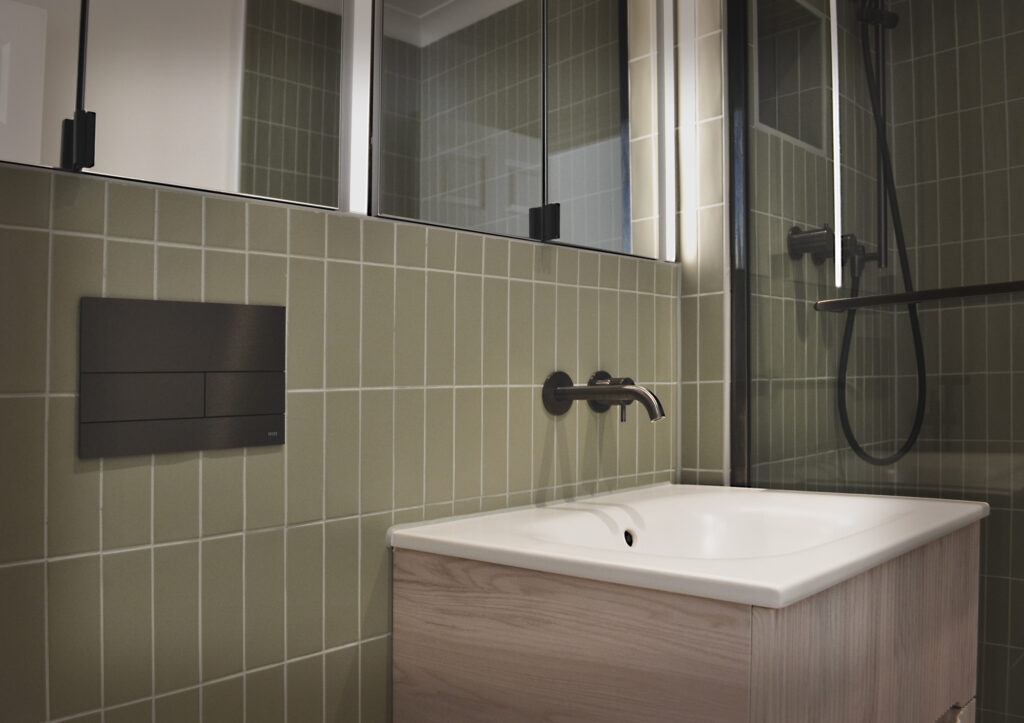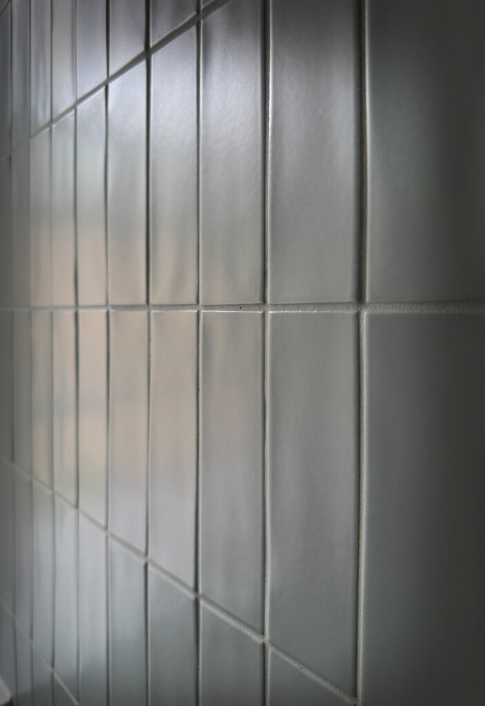 The two bathrooms showcase exceptional attention to detail. Italian tiles in sage green and light blue are laid with alternating vertical and horizontal orientations, creating articulation and visual hierarchy that brings subtle dynamism to the wall surfaces. Custom-painted metal tile trims, precisely matched to the grout color, ensure a seamless, integrated finish that demonstrates the level of care invested in every detail.