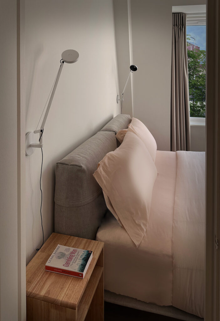 In the kitchen, pendant lights provide focused task lighting for casual meals while maintaining the clean aesthetic. Wall-mounted articulated reading lights in the bedrooms eliminate the need for bedside tables, maximizing usable floor area while providing focused task lighting precisely where needed.
