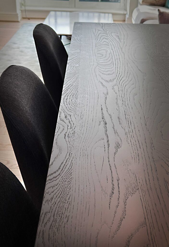 Italian-made wardrobes in the bedrooms provide ample storage while maintaining the clean aesthetic, their handleless fronts echoing the kitchen cabinetry’s minimal detailing. The bed, also crafted in Italy, features simple lines that reinforce the apartment’s contemporary character. Dark-stained oak dining furniture, including three-legged stools at the breakfast bar and a dining table with matching chairs, provides tonal contrast and defines the eating areas within the open plan.