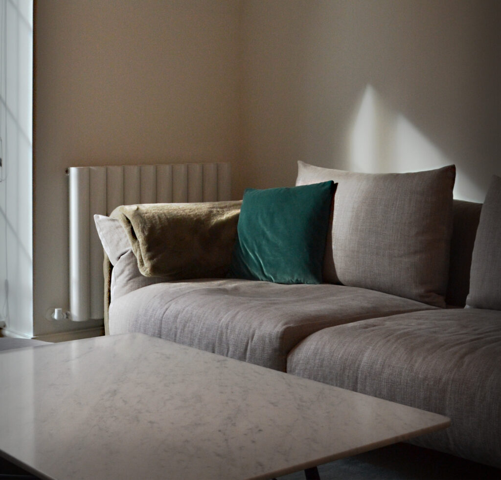 The apartment’s furnishing demonstrates the same restraint evident in its architectural treatment. A generously proportioned Italian-made sofa upholstered in pale linen anchors the living area, its comfortable proportions and textured fabric complemented by cushions in deeper greys and a single accent of emerald green velvet. This approach to color—a predominantly neutral base punctuated by occasional deeper tones—creates visual interest while maintaining overall harmony.