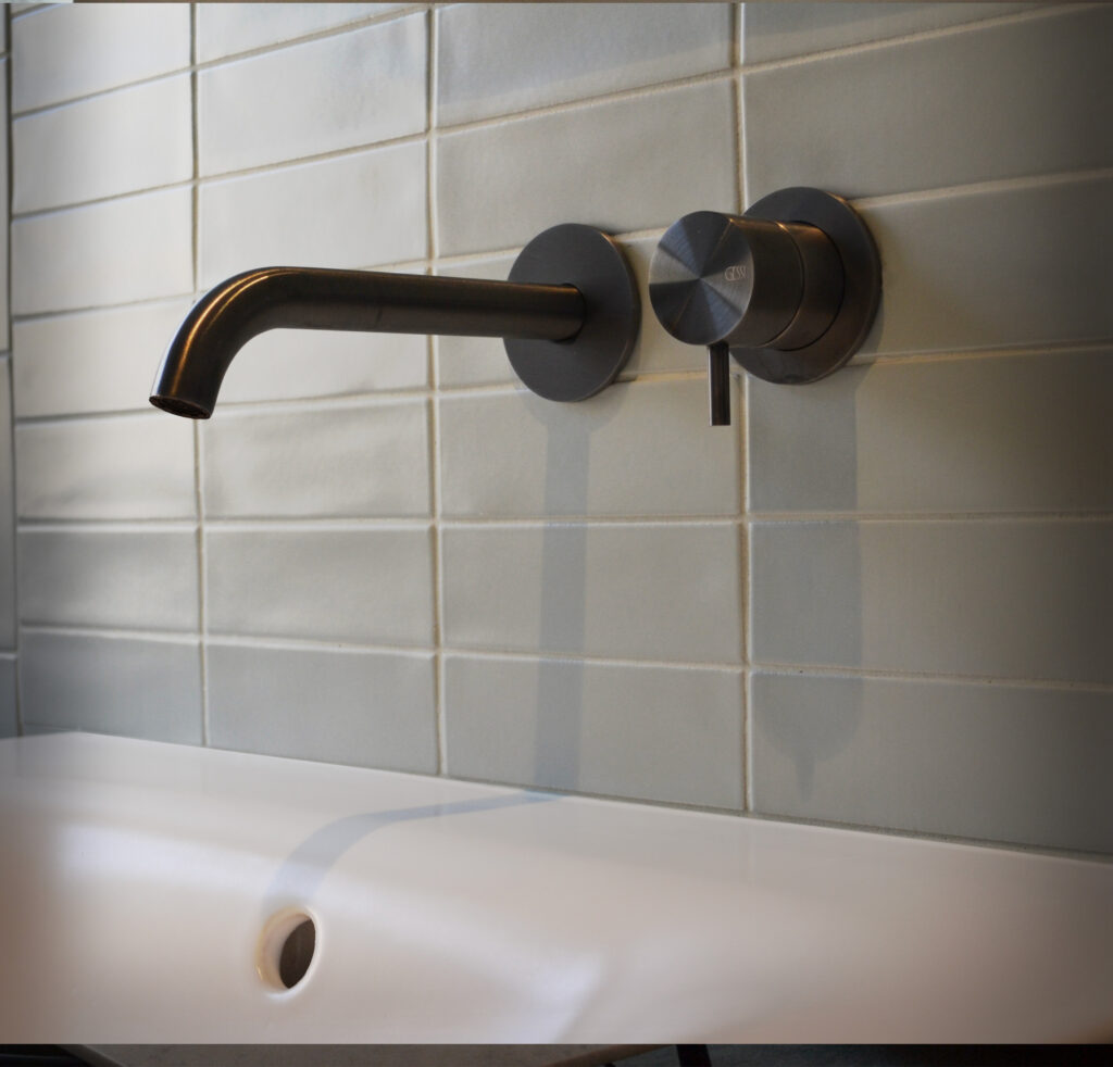 All bathroom tapware, sourced from Italian manufacturers, is finished in Black Metal Brushed PVD. Wall-mounted basin mixers eliminate visual clutter on the countertops while their dark finish provides graphic punctuation against the white sanitaryware and tiles.